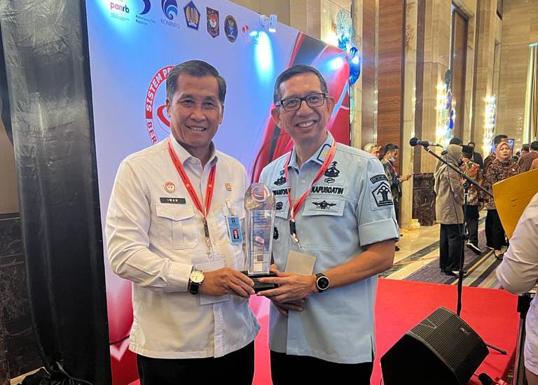 Penghargaan diserahkan langsung oleh Menteri Koordinator Bidang Maritim dan Investasi, Luhut Binsar Pandjaitan didampingi Menteri Pendayagunaan Aparatur Negara dan Reformasi Birokrasi (PANRB), Abdullah Azwar Anas dalam acara SPBE Summit 2023, di Hotel Kempinski Jakarta, Senin (20/03/23).