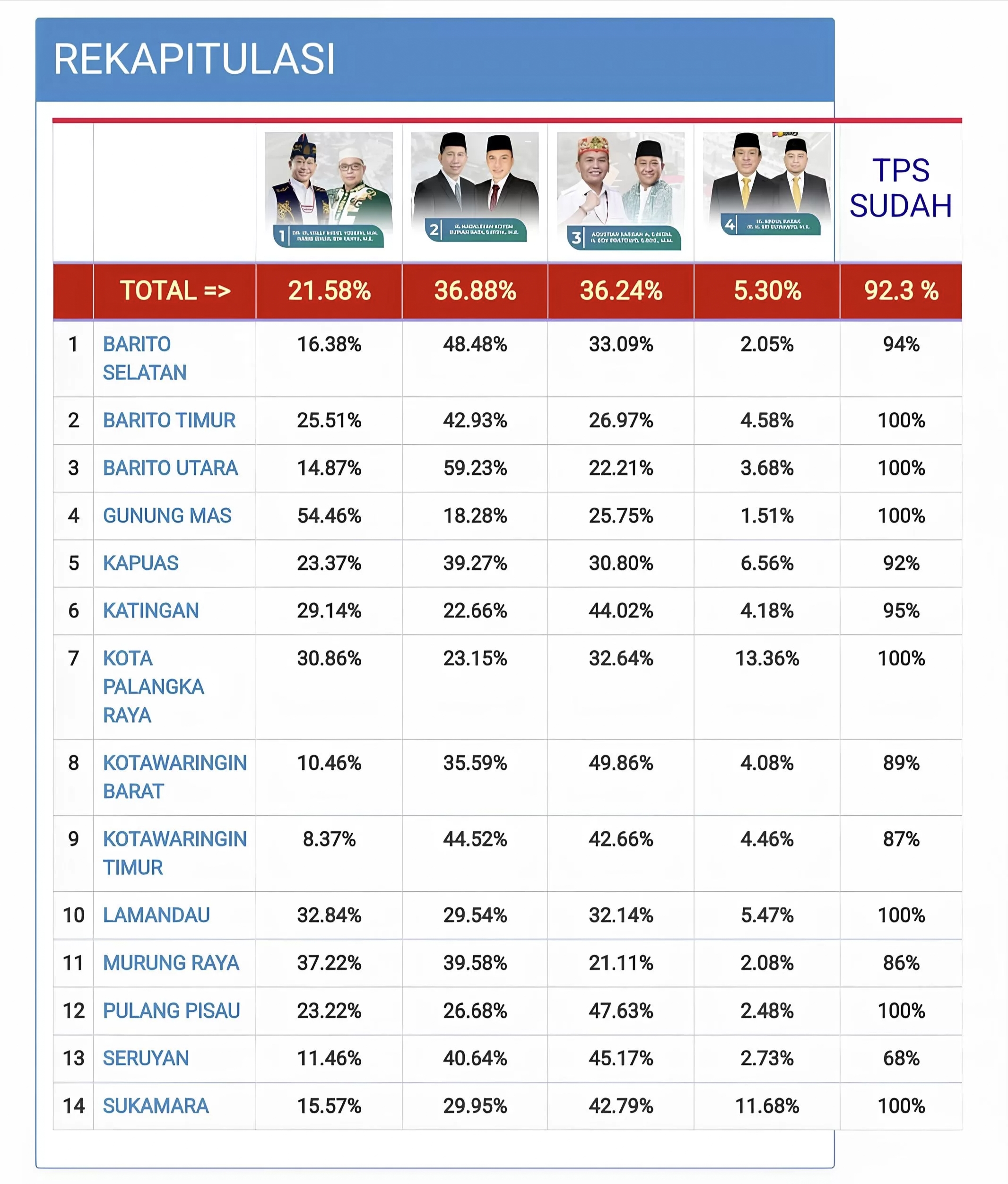 Palangka Raya | Proses penghitungan suara Pilgub Kalimantan Tengah (Kalteng) tahun ini telah mencapai 92,3%…